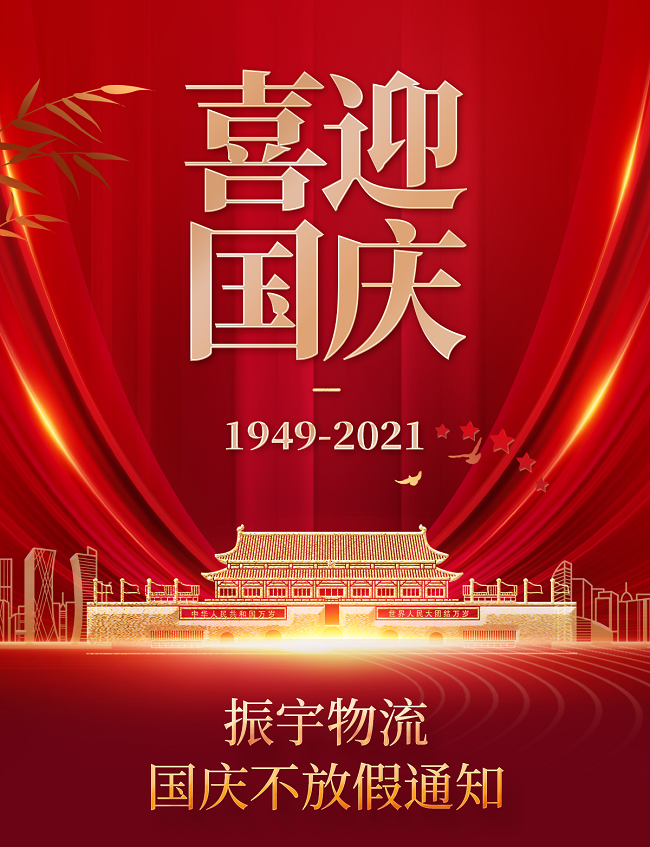 您好!正值秋高氣爽天,恰逢稻熟豐登日,祖國母親即将迎來72周年華誕。五星紅旗迎風飄揚,我們同慶祖國華誕的榮光!振宇物流爲瞭(le)給您提供更好的服務,並(bìng)結合我司實際情況,現對國慶假日期間做出如下工作安排: