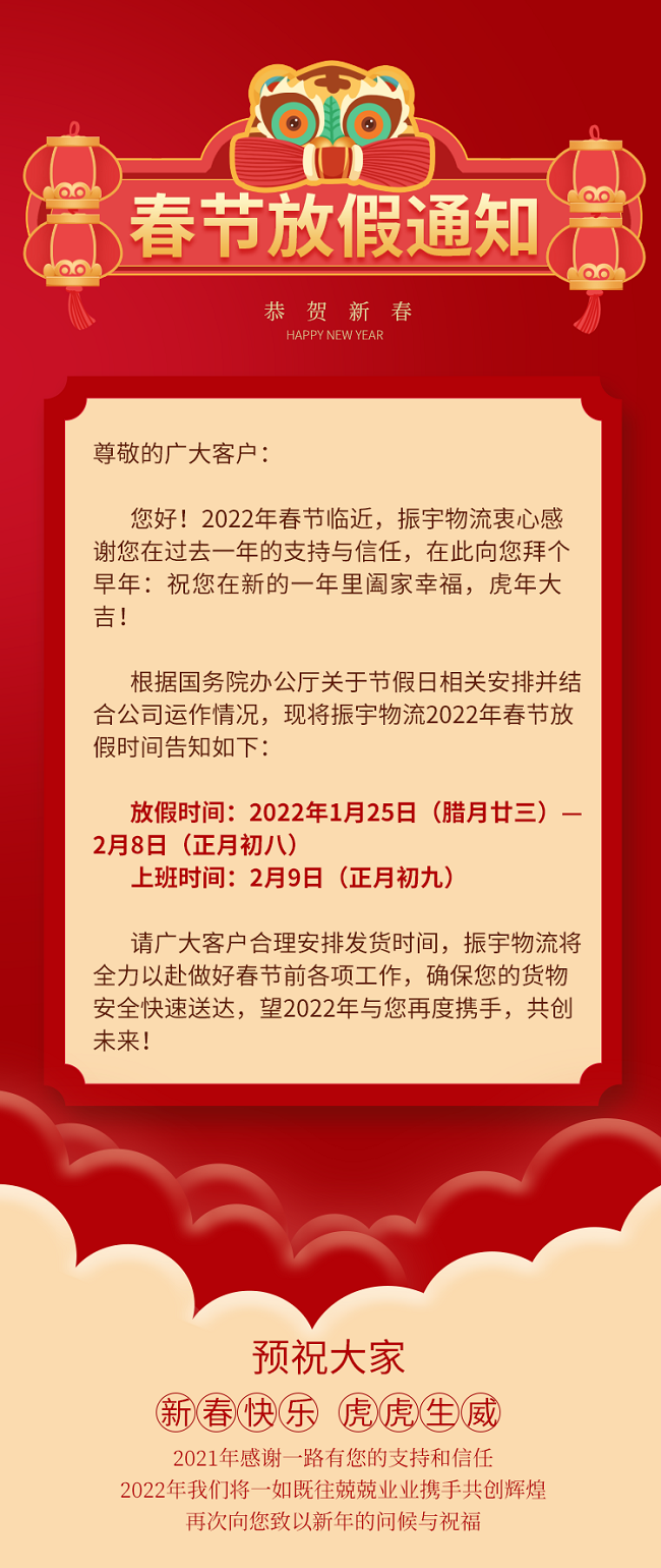 您好!2022年春節臨近,振宇物流衷心感謝您在過(guò)去一年的支持與信任,在此向您拜個(gè)早年:祝您在新的一年裏阖家幸福,虎年大吉!