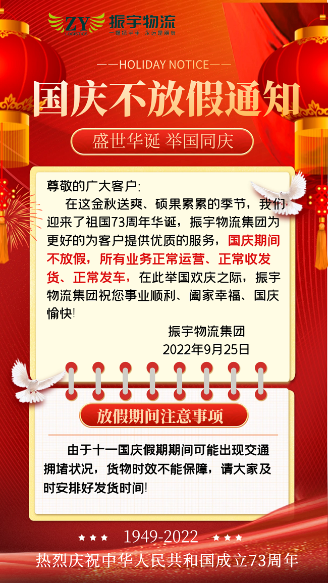 在這金秋送爽、碩果累累的季節 ,我們迎來瞭祖國73周年華誕,振宇物流集團爲更好的爲客戶提供優質的服務,國慶期間不放假,所有業務正常運營、正常收發貨、正常發車,在此舉國歡慶之際,振宇物流集團祝您事業順利、阖家幸福、國慶愉快!