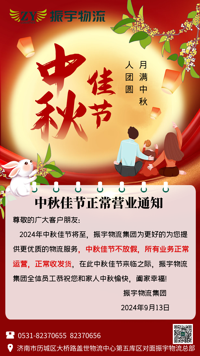 2024年中秋佳節将至,振宇物流集團爲更好的爲您提供更優質的物流服務,中秋佳節不放假,所有業務正常運營,正常收發貨,在此中秋佳節來臨之際,振宇物流集團全體員工恭祝您和家人中秋愉快,阖家幸福!
