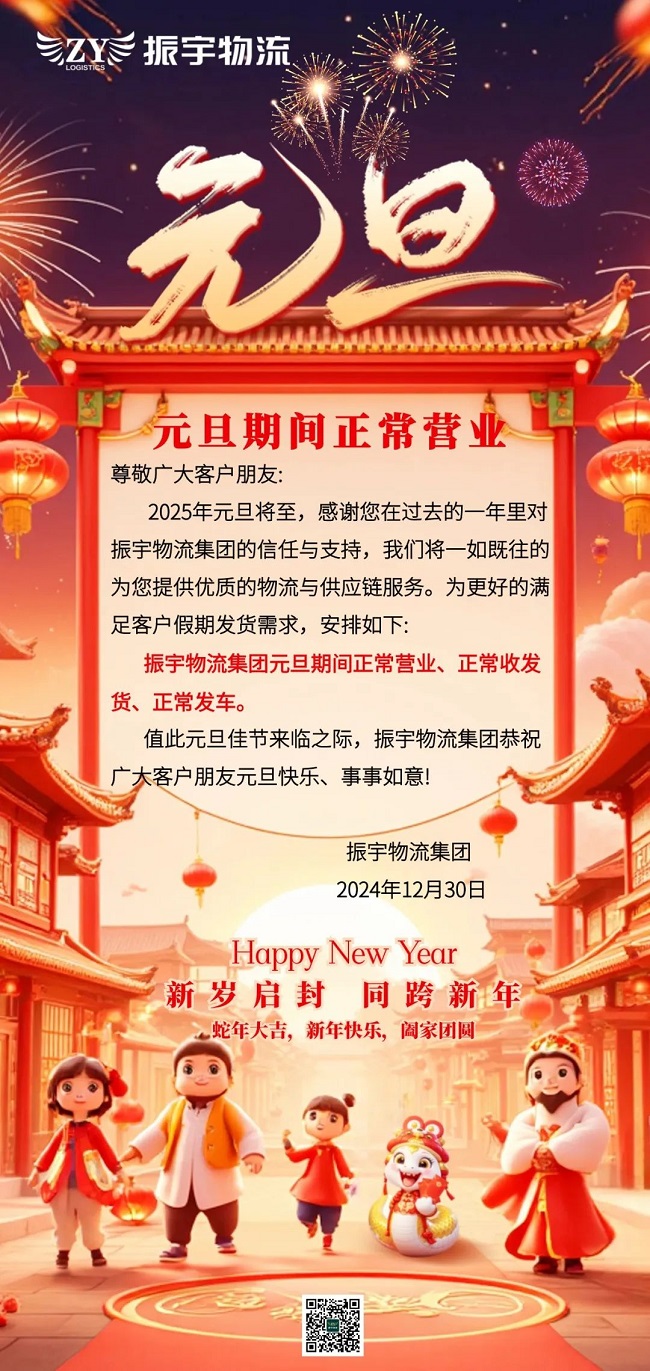 2025年元旦将至,感謝您在過去的一年裏對(duì)振宇物流集團的信任與支持,我們将一如既往的爲您提供優質的物流與供應鏈服務。爲更好的滿足客戶假期發(fā)貨需求 ,安排如下: