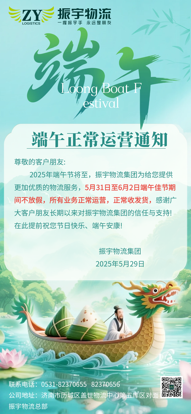 2025年端午節将至,振宇物流集團爲給您提供更加優質的物流服務,5月31日至6月2日端午佳節期間不放假,所有業務正常運營,正常收發貨,感謝廣大客戶朋友長(zhǎng)期以來對(duì)振宇物流集團的信任與支持!在此提前祝您節日快樂、端午安康!