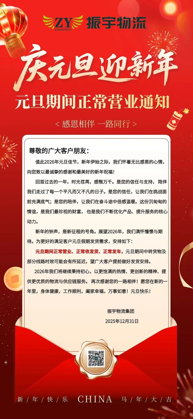 2026年我們将繼續秉持初心,以更飽(bǎo)滿的熱情、更創(chuàng)新的精神、提供更優質的物流與供應鏈服務。再次感謝您的一路相伴!願您在新的一年裏,身體健康,工作順利,阖家幸福,萬事如意!元旦快樂!