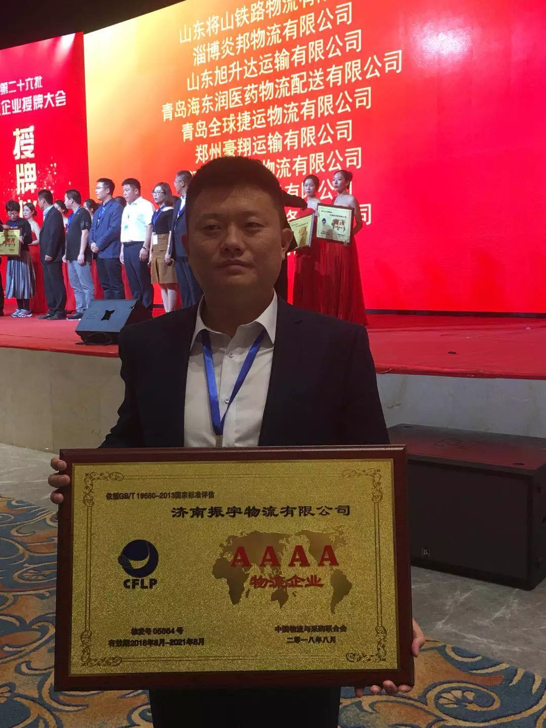 2018年9月16日,由中國物流與採(cǎi)購聯合會主辦(bàn)的A級物流企業授牌大會暨物流業創新發展論壇在吉林省長春市隆重舉行。會議對本批A級物流企業進行瞭集中授牌,濟南振宇物流有限公司榮獲國家AAAA級物流企業,總經理張憲振代表公司出席會(huì)議並(bìng)接受授牌。