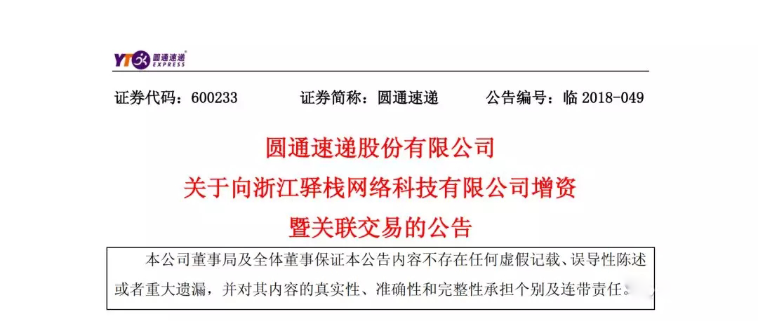 物流指聞最新獲悉,圓通速遞(dì)發布公告稱(chēng)爲提升公司末端派送服務時效,拓展多元化派送渠道,落實終端戰略布局,公司與圓澤投資、菜鳥供應鏈、中通吉網絡、福杉投資、申通投資、百世物流科技及雲鋒(fēng)麒泰於(yú)5月29日在杭州共同簽署《關於(yú)浙江驿棧網絡科技有限公司之增資協議》。
