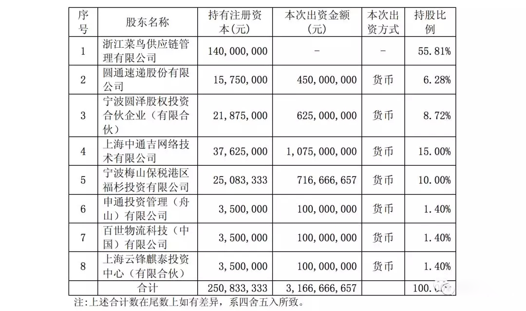 公告顯示,2018年第一季度,浙江驿棧總資産(chǎn)6922萬元,總負(fù)債7257.9萬元,淨資産(chǎn)-335.9萬元,營業收入483.3萬元,淨利潤-1.14億元。本次增資前,浙江驿棧由浙江菜鳥供應鏈100%控股,本次增資後(hòu)浙江驿棧的股本結構(gòu)如下: